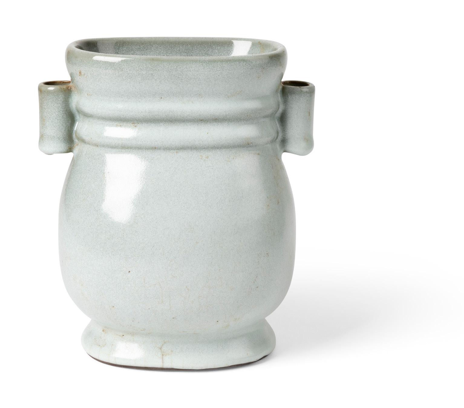 the body supported on a tall splayed foot, the shoulders encircled by a band of archaistic taotie motif against a keyfret pattern, the lower body further decorated with a band of kui-dragon pattern interrupted by notched flanges, and further with plantain leaves with phoenix motif, some decoration highlighted with parcel-gilt, the shoulders flanked with elephanthead handles 34.5cm high; 5400g