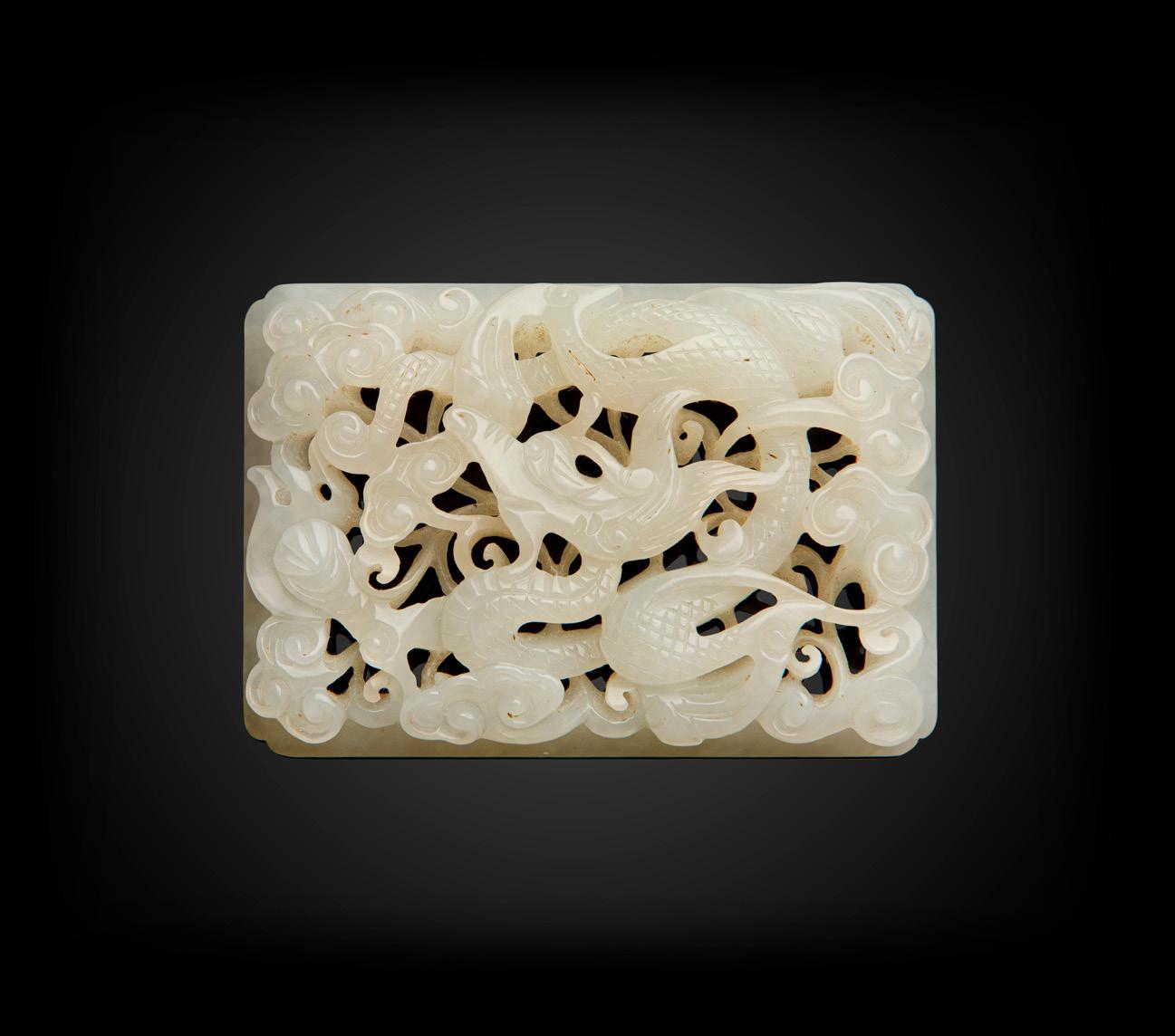 LIAO DYNASTY, 11TH-12TH CENTURY 遼 絲織束口袋 含白玉環 of rectangular form, composed of sections of fine woven silk, with a fastening cord attached to the upper side of the bag, two white circular jade fittings to hold the fastening cord, decorated with large rhombus with palmette to centre and floral buds in corners, lotus flowers and clouds, lining of brown gauze 40cm x 30.5cm