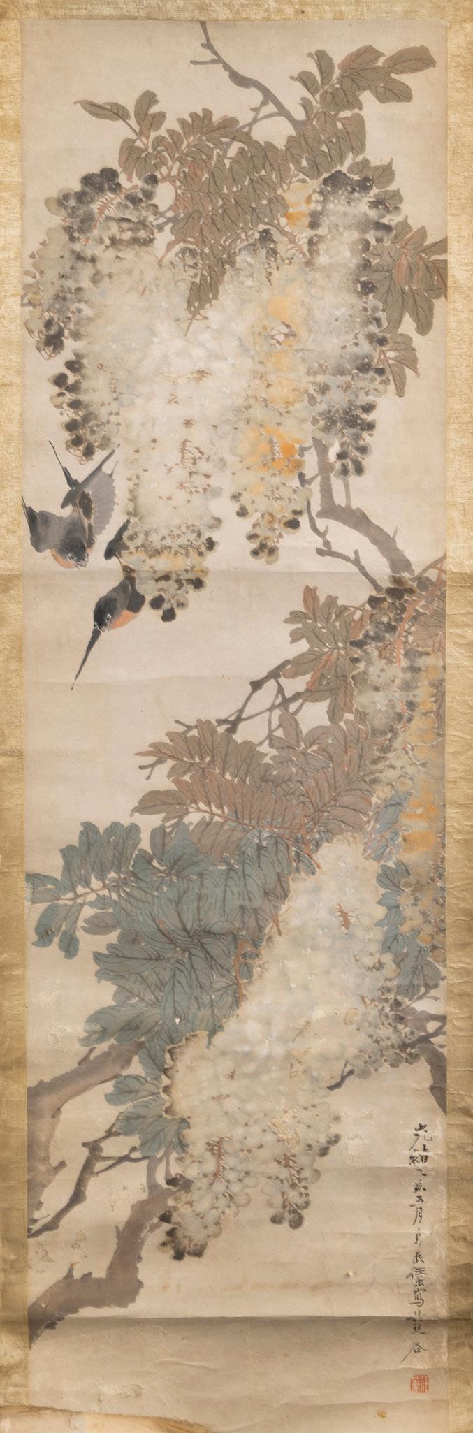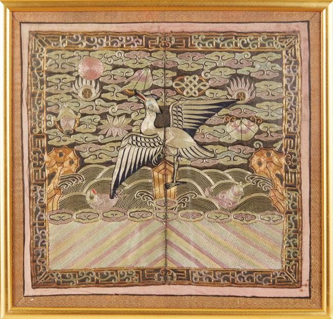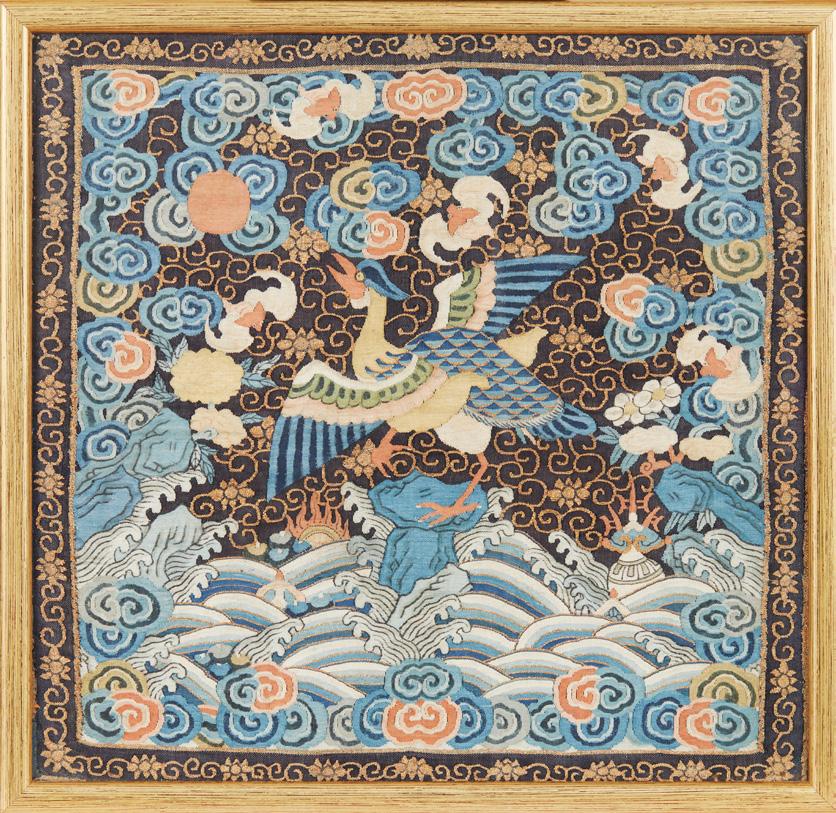 A further comparable weft-faced compound twill with flowers, cranes, and clouds decoration, dated to the Liao dynasty, 10th century, is in the Cleveland Museum of Art, inv. nos. 1992.112a £1,500-2,000