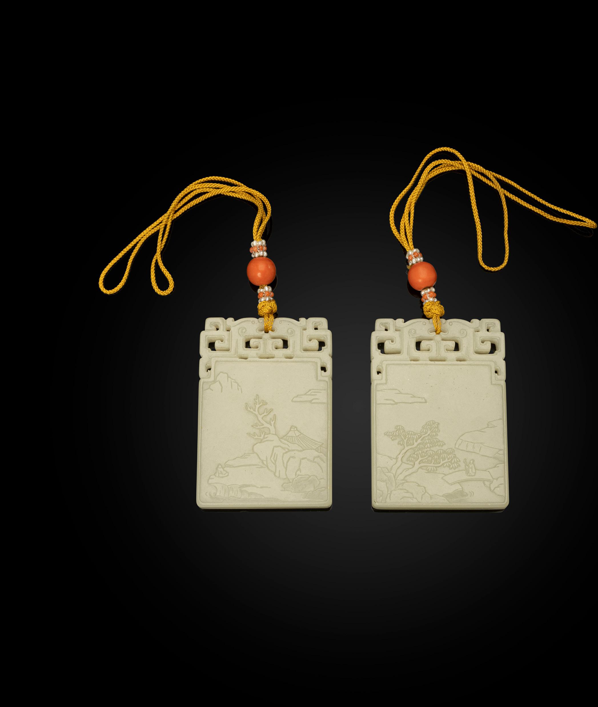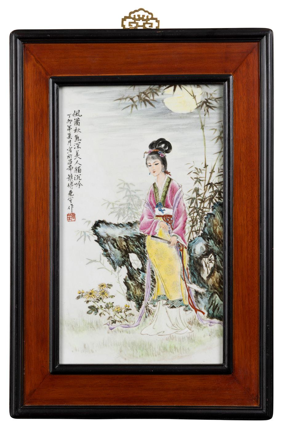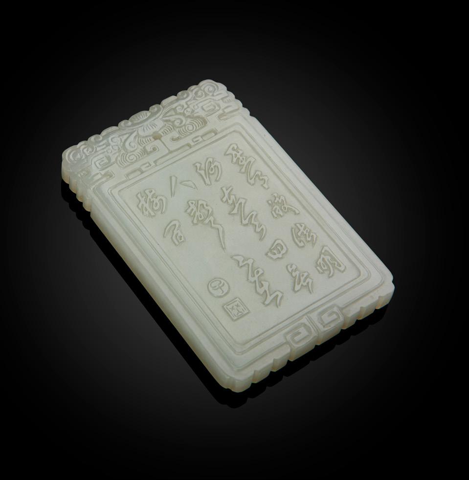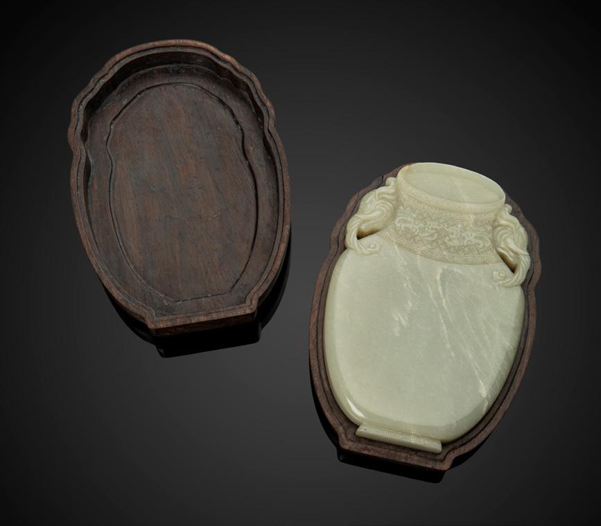 carved in low relief with a scene of two ladies studying in a garden setting, the other side incised with a Song dynasty poem by Qin Guan and ‘Wu Zhifan’ mark 15.4cm high