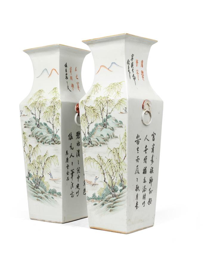 each cast with large flaring trumpet mouth and supported on gently everted foot, the neck with four leaf-shaped panels, the mildly protruding central section divided into four quadrants by raised ridges, each quadrant detailed with taotie mask against leiwen ground, the foot further divided into four quadrants, each quadrant with geometric pattern against leiwen ground (2) heights: 24.5cm and 24.7cm; 1368g and 1382g £2,000-3,000