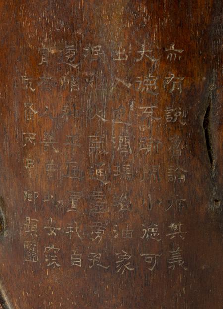 carved from a section of natural tree trunk, the exterior carved in relief with small figures in a village setting surrounded by large pine trees, the reverse incised with a poem, including a line of Qianlong Bing Wu year, the mouth rim and the base mounted with hardwood, the interior covered in lacquer 18.5cm wide £4,000-6,000