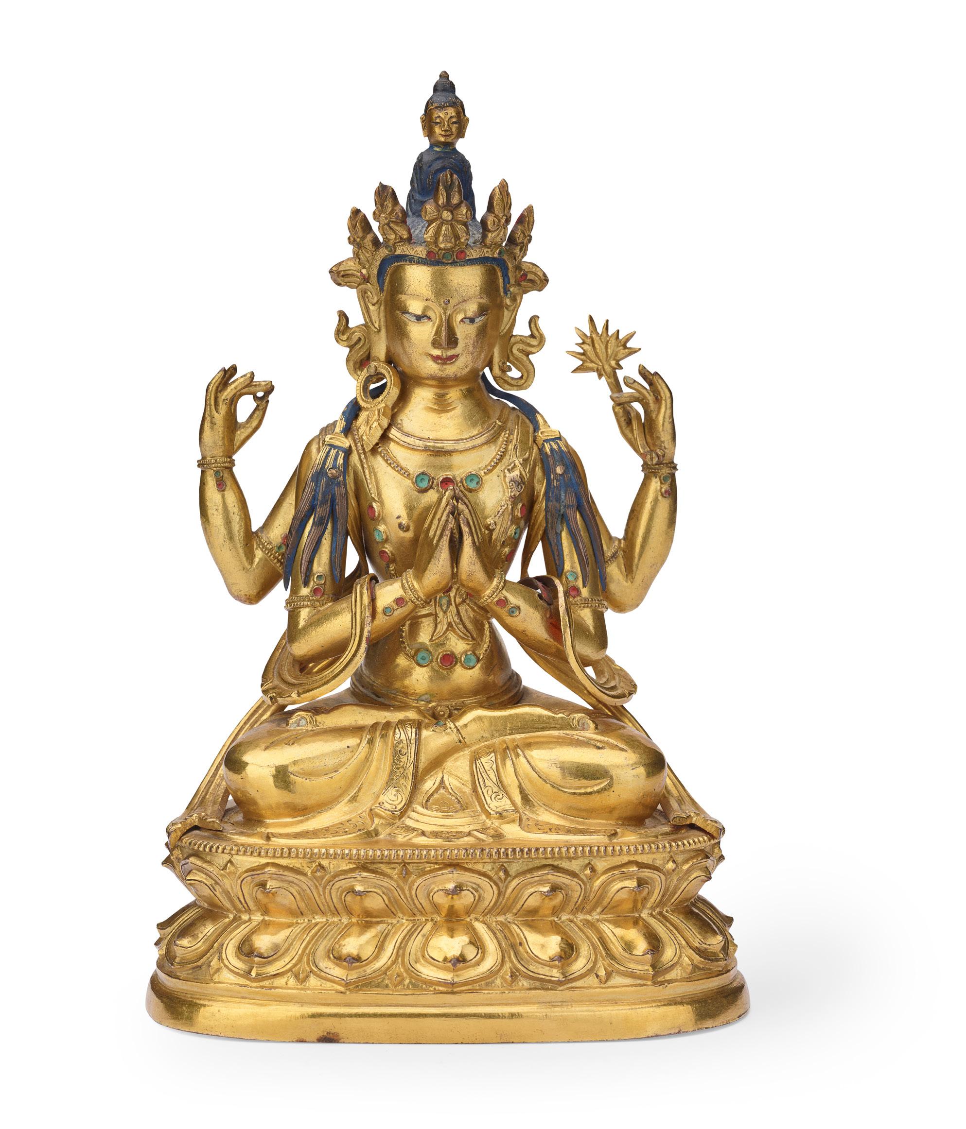seated in dhyanasana, two hands raised in karana mudra, the deity wears a voluminous robe with chest exposed, the downcast eyes and serene face below a cap secured by hoop with ruyi and jewel