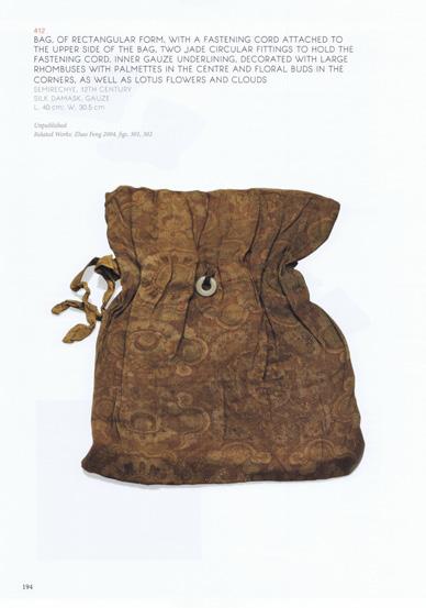 Roughly a thousand years old, this fine silk bag is a rare survivor and a testimony to the extensive trade network passing through Central Asia during the eleventh/twelfth century. The quality of the silk and craftsmanship itself, largely lost today, further bears witness to the importance of the silk-route from China. Comparable flower pattern is illustrated in Liao Textiles and Costumes, Zhao Feng (ed.), Hong Kong, 2004, fig. 183; an embroidered bag with similar form and fasten-cord design in the Mengdiexuan Collection, Hong Kong is also illustrated in the same book, fig. 302.