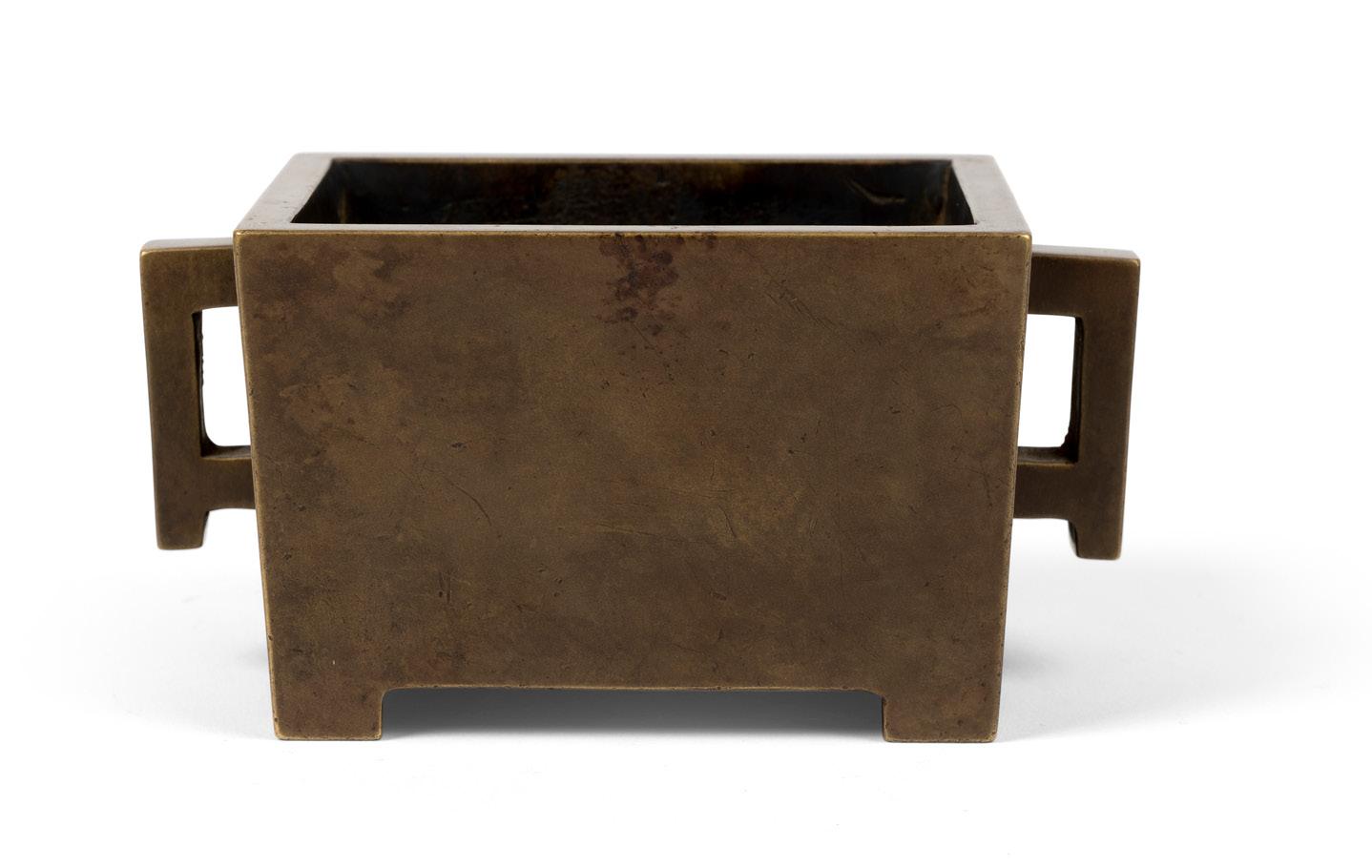 of compressed bulbous form supported on three short tapering feet, flanked by a pair of upward facing loop handles on the rim, the base with a six-character ‘Xuan De Wu Nian Zhi Zao (Made in the Fifth Year of Xuande Reign)’ in a recessed panel 19.5cm wide; 2767g