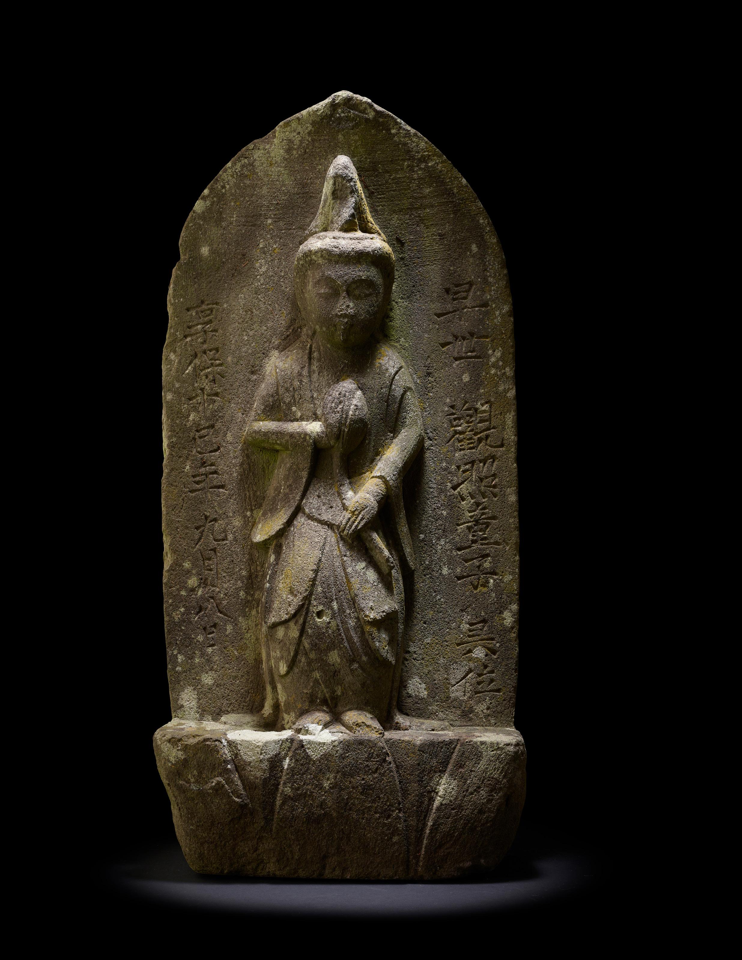 Shrines in the form of a grotto are more common in porcelain form, especially from the Longquan kiln produced in the Ming dynasty than wooden sculptures. Compare to a similar three-storey Buddhist and Daoist temple, dated to early Ming dynasty 14th-15th century, was sold at Christie’s Hong Kong, 30 May 2022, lot 2819; a further comparable ‘grotto’ shrine with Guanyin, with similar ruyi clouds and sun disc, was sold at Christie’s London, 18 May 2012, lot 1175.