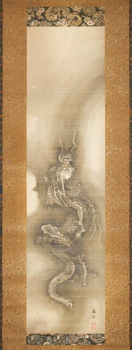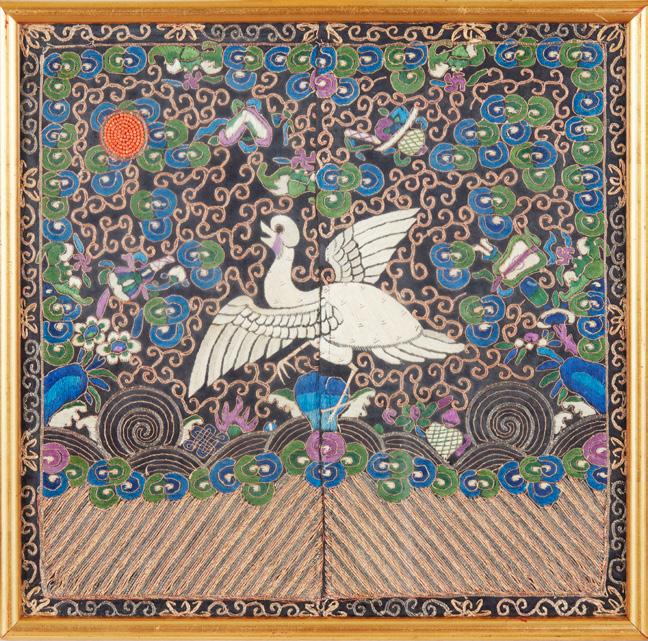 The panel presented here embodies all the requirements of an imperial textile, created especially for the emperor’s throne cushion. It depicts a front-facing five-clawed dragon flanked by a pair of dragons amidst auspicious clouds above turbulent rolling waves emitting foam and spray, crashing against three jagged rocks.