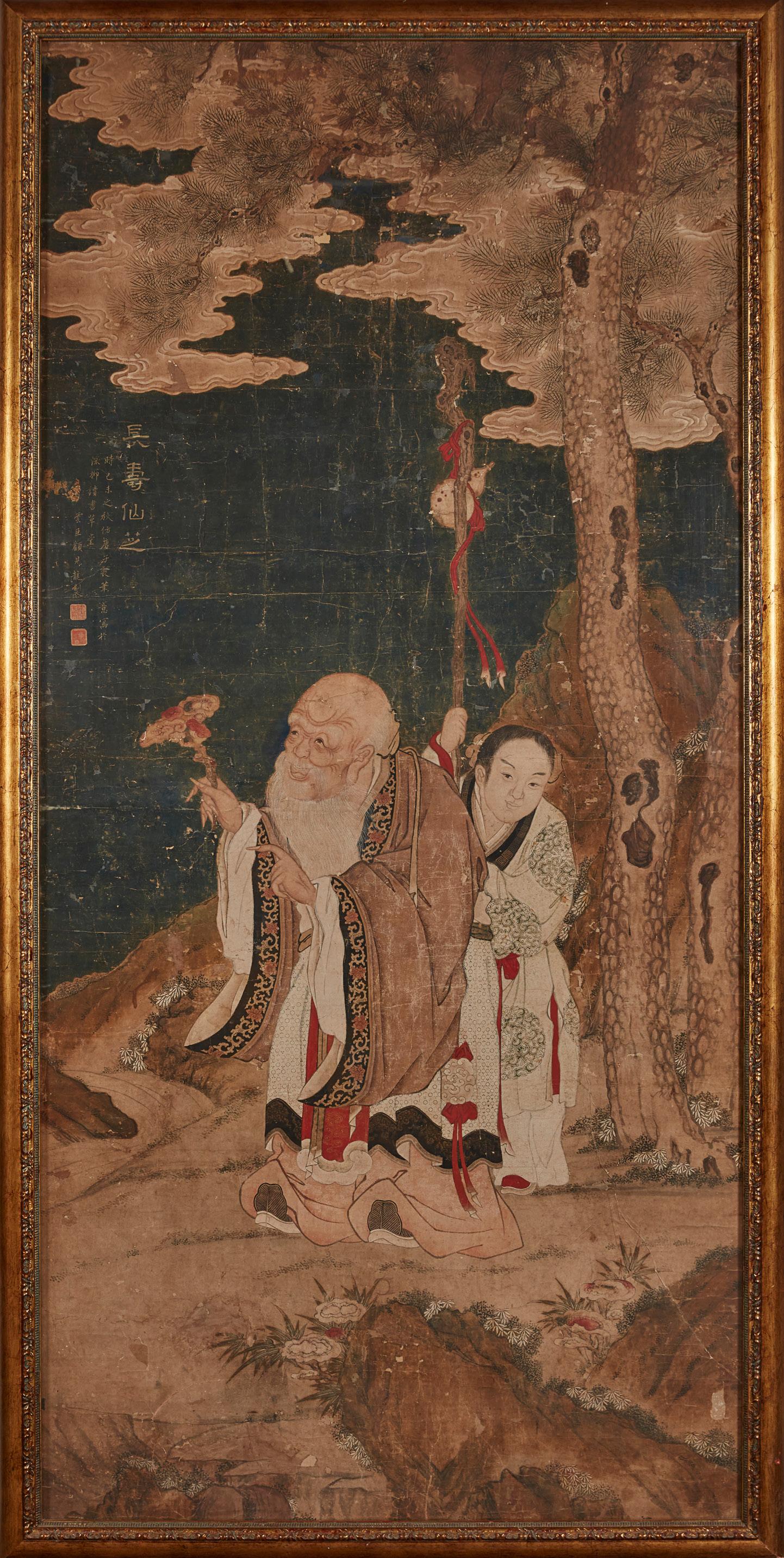 Note: This unusual carved wooden shrine has a highly comparable example with design in a Longquan celadon-glazed shrine, now in the collection of the British Museum, museum no. 1929,0114.1. It is larger in size (50.3cm high) and dated to the auspicious day of the Chu Festival (Dragon Boat Festival) in the Bingxu year of the Yongle reign, 1406AD. With all the gilded deities intact, one could assume the low circular plinths flanking the lower niche in this lot would similarly contain a pair of protectors guarding the central main deities; the three stepped-pedestals with seated Daoist deities in the middle niche; and on the top niche, a mighty figure, possibly Zhenwu, would mount the mythical beast as vahana.[1]