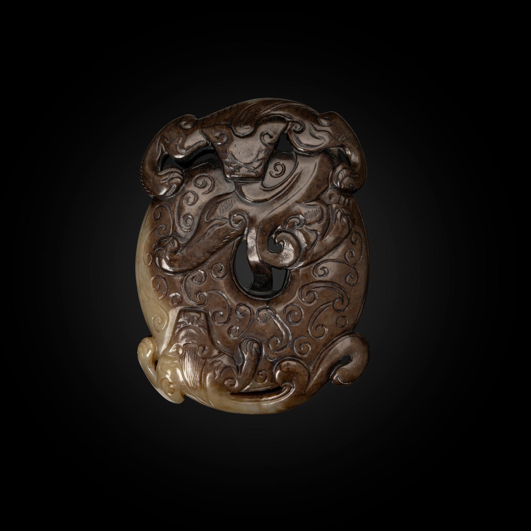 modelled in the form of a taotie mask detailed with large bulging eyes, prominent nostrils and curled horns 16.2cm wide; 382g
