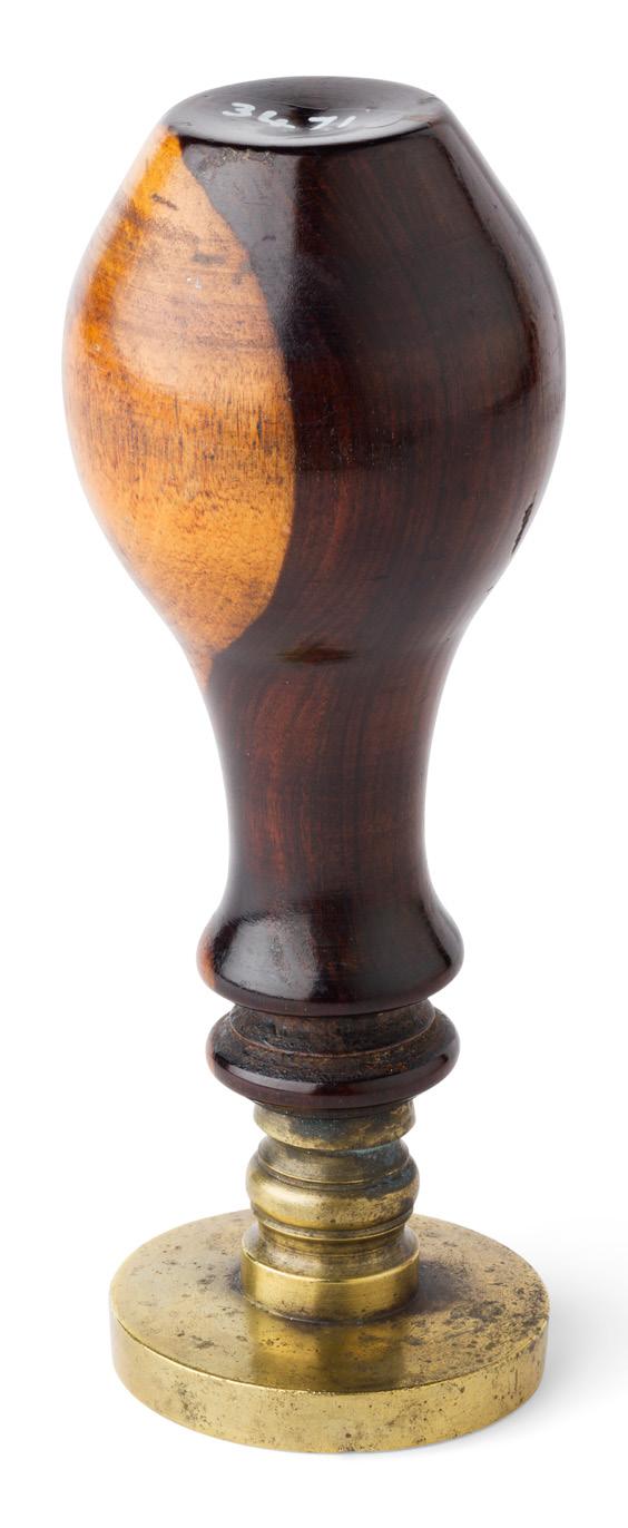 the wooden baluster handle with mushroom capped terminal, to a brass collar and integral matrix, engraved with the arms of Stuart and a martlet cadency for the fourth son and the motto NOBILIS IRA