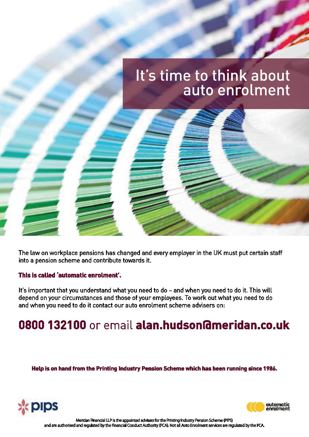 Meridan Financial LLP is the appointed advisers for the Printing Industry Pension Scheme (PIPS) and are authorised and regulated by the Financial Conduct Authority (FCA). Not all Auto Enrolment services are regulated by the FCA.