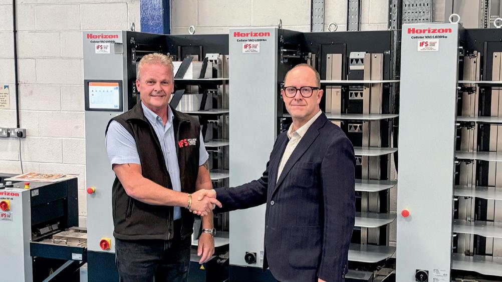 Image shows Dean Stayne from IFS and Paul McGuigan, Director of Pyramid Press, with the Horizon iCE StitchLiner Mark IV www.ifsl.uk.com