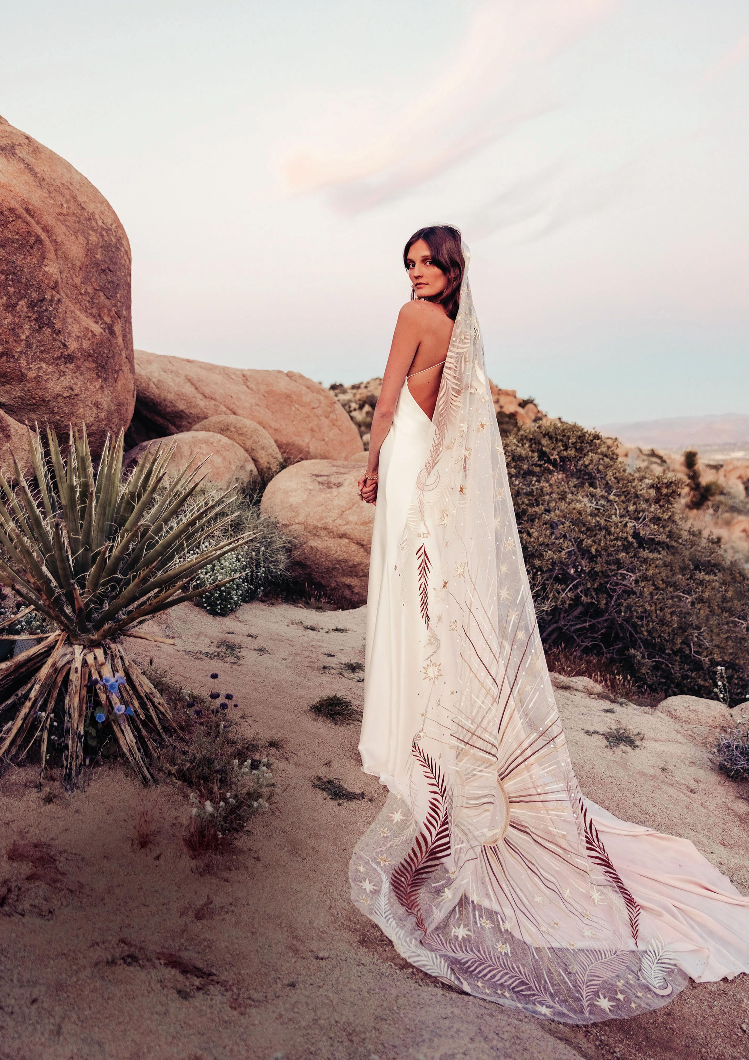 Inspired by desert blossoms in spring, Cora’s fully embroidered, vibrant florals are set on sand-dyed tulle to amplify the beautiful contrast of blooms throughout a bare terrain.