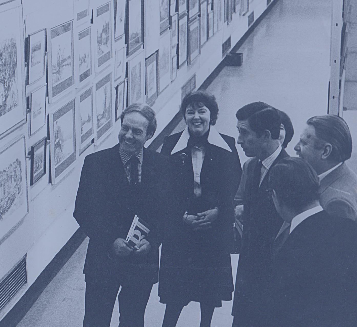 Caption: King Charles III (then HRH The Prince of Wales) at the RI Exhibition at Mall Galleries in 1988 with ( left to right ) Past President Ronald Maddox, Sheila Mitchell (Mrs. Charles Bone), President the Society of Portrait Sculptors and the then RI President, Charles Bone.
