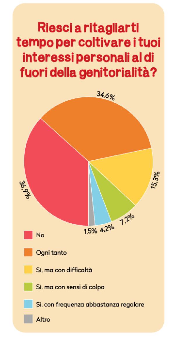 La stragrande maggioranza dei genitori intervistati (71.5%) non riesce a ritagliarsi sufficiente tempo per coltivare i propri interessi. Essere genitori è un impegno che richiede dedizione ed energie, un viaggio quotidiano di crescita accanto ai propri figli. Resta di grande importanza il valore del tempo da dedicare a se stessi, non solo per il proprio benessere psicofisico, ma anche per