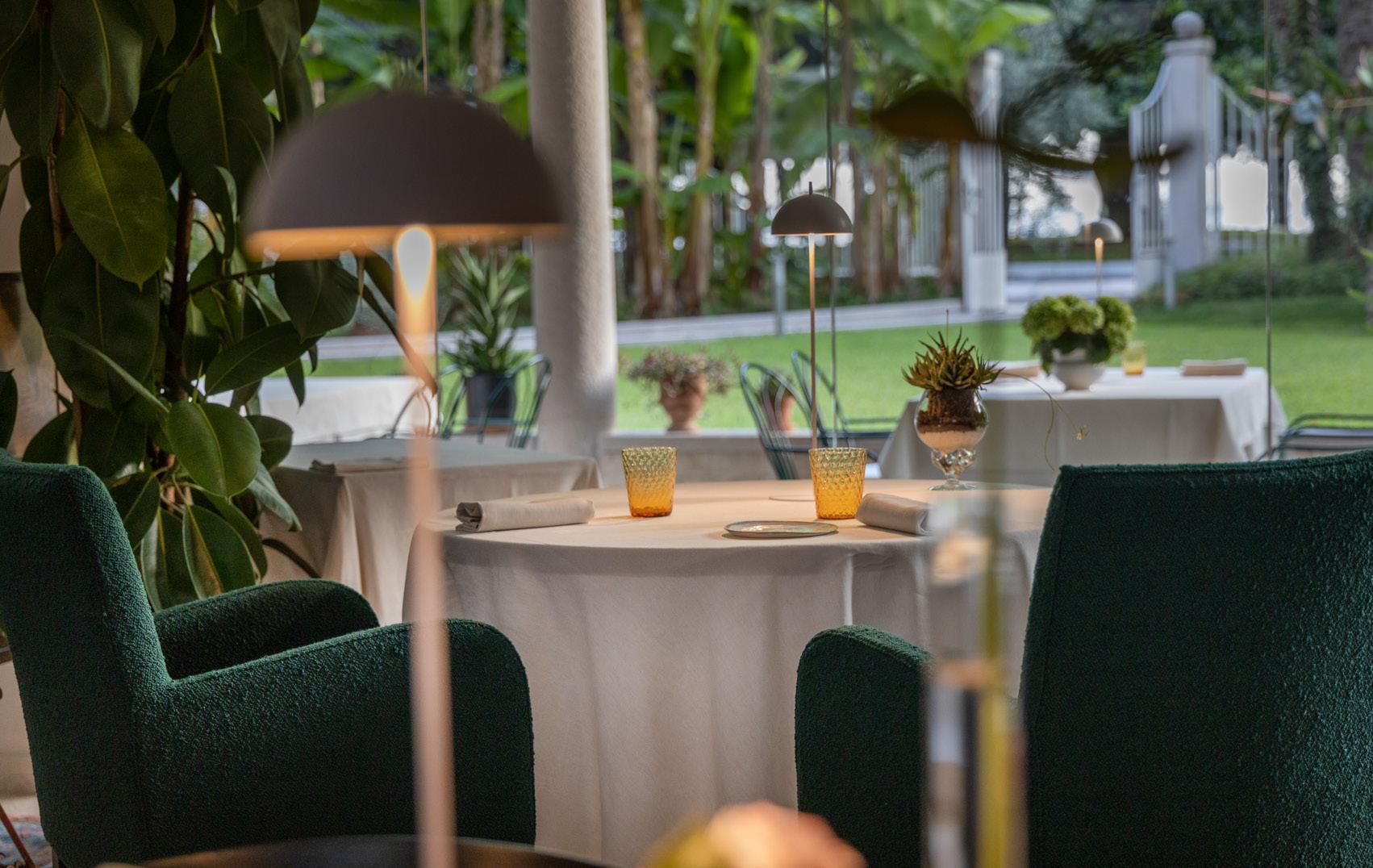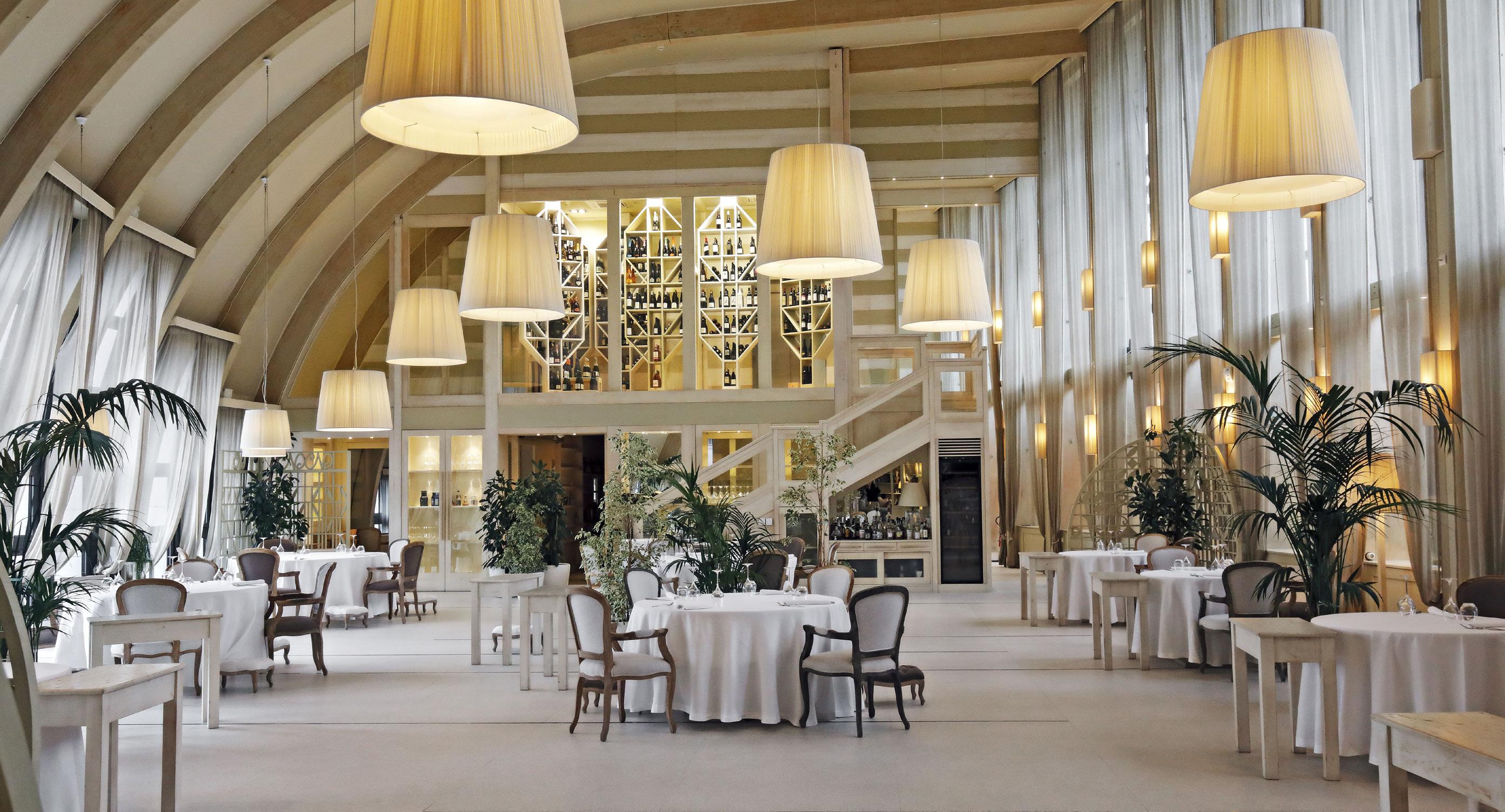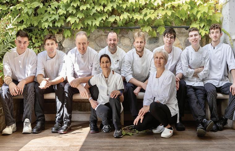 gina, erbe e spezie della macchia locale, pesce si ritrovano nelle raffinate ricette proposte dall’executive chef Laurent Renard e dalla sua brigata, che si possono assaggiare nei tre ristoranti del Domaine, di cui uno stellato. La Table de la Ferme offre una cucina rustic chic da gustare nel corpo centrale della fattoria, due eleganti saloni impreziositi da grandi camini. La formula “I piattini”, sorta di tapas che invitano alla condivisione, viene servita nel lounge bar e, durante la bella stagione, in veranda e nei salotti sotto il pergolato davan- ti al green del golf. È sempre accompagnata dai vini della cantina interna, che annovera notevoli etichette corse, grandi denominazioni francesi e i migliori Champagne. Da non perdere il viaggio nell’alta cucina proposto dal ristorante 1 Stella Michelin, residenza estiva di Mathieu Pacaud. I piatti tipici della tradizione locale sono appannaggio de La Table de la Grotte, una location molto suggestiva ricavata in una cavità naturale, con ristorante, bar e cantina, tavoli in legno decorati con candelabri e un imponente camino sempre acceso. Lo stupore continua all’esterno, sulle terrazze panoramiche integrate nelle curve naturali della roccia, che offrono una vista mozzafiato tra mare e montagna. Imperdibile un aperitivo in musica al tramonto. Infine, la Table de La Plage, ispirata a una capanna di pescatori, è aperta in estate e offre una cucina di mare nella splendida spiaggia privata. Tavoli, sedie e strutture sono realizzati in legno di deriva, sistemati su terrazze tra ginepri e lentischi.