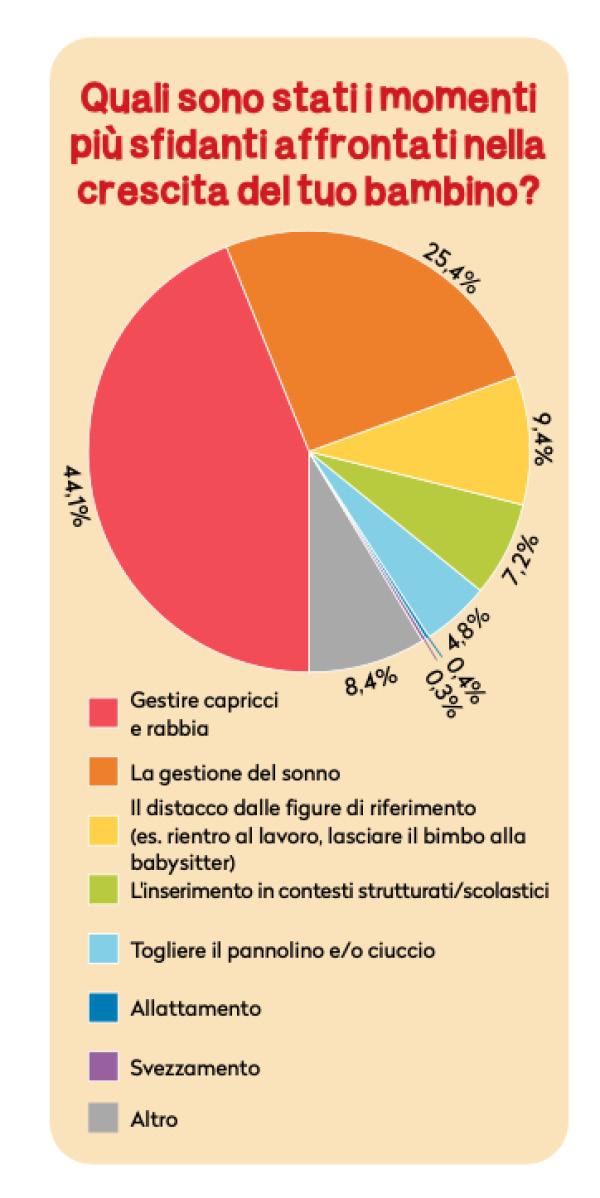 Per il 44% dei genitori italiani la sfida principale nel crescere un figlio è la gestione dei capricci e della rabbia, seguita dall’educazione al sonno (25.4%). Affrontare le crisi emotive dei bambini può essere difficile, specialmente quando manca il supporto o quando si viene condizionati da giudizi esterni. Tuttavia, comprendere le necessità implicite dei bambini dietro le loro difficoltà e adottare approcci educativi basati sulla comprensione e sull’accoglienza delle emozioni può aiutare a vivere queste situazioni in maniera costruttiva. Allo stesso modo, la gestione del sonno autonomo presenta ostacoli significativi per i genitori, che spesso si trovano a fronteggiarne le conseguenze anche sui propri cicli di riposo. Comprendere la fisiologia del sonno infantile e adottare abitudini sane può contribuire a mitigare queste difficoltà e a favorire il benessere generale di bambini e famiglie. «La genitorialità regala momenti di grande sod-