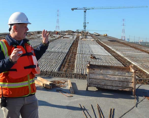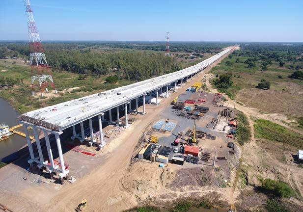 obra impulsará el desarrollo urbanístico y turístico en ambas márgenes del río Paraguay. Con siderando estos factores, el proyecto incorporó y combinó elementos importantes como las franjas seguras para el paso peatonal, bicisendas, ba randas antisuicidio y el componente medio ambiental. La forma del dise ño ya se puede apreciar mediante la altura que van tomando los pilares de los viaductos de acceso, tanto del lado de Chaco´i como de la Costanera Norte de Asunción. El ingeniero Izan Gomes de Lacerda, director de Obras, alabó la aerodinámica de la obra, pero también se refirió al beneficio del diseño. “La belleza de esta obra es
