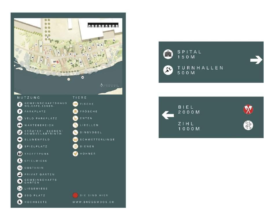 Aufgabe: Meine Aufgabe bestand darin, eine Karte zu erstellen, auf der die vorgeschlagenen Strassen und Wege dargestellt sind, sowie Schnitte zu erstellen, um die Masse gemäss den von der Stadt Brügg geforderten Standards besser zu verstehen. Alle Schnitte und Karten wurden mit Photoshop und Indesign erstellt.