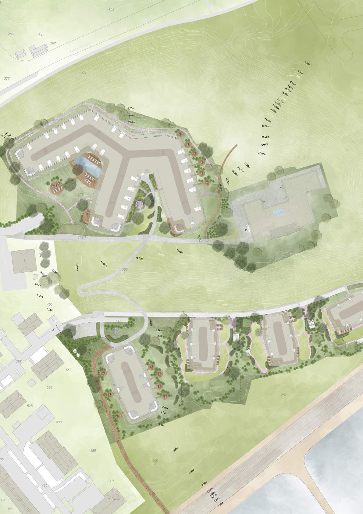 Beschreibung: Das Ziel dieser Wettbewerbsphase war es, eine Analyse der Strassenbenutzungshierarchie zu erstellen, um die Bevölkerung und ihre Nutzung besser zu verstehen. Auf der Grundlage der von der Stadt Brügg durchgeführten Machbarkeitsstudie koordinierte unser Team die Velo- und Fussgängernetze entsprechend der Nutzung des Viertels und verband jeden Weg mit einem interessanten Punkt, wie z. B. einer bestehenden Brücke, die die Einwohner der nahe gelegenen Stadt verbindet. Auf den folgenden Seiten finden Sie Studien zur Topogrophie und Hydrologie des Geländes, denn das Ziel des Projekts war die Revitalisierung des Seeparks in Brügg.