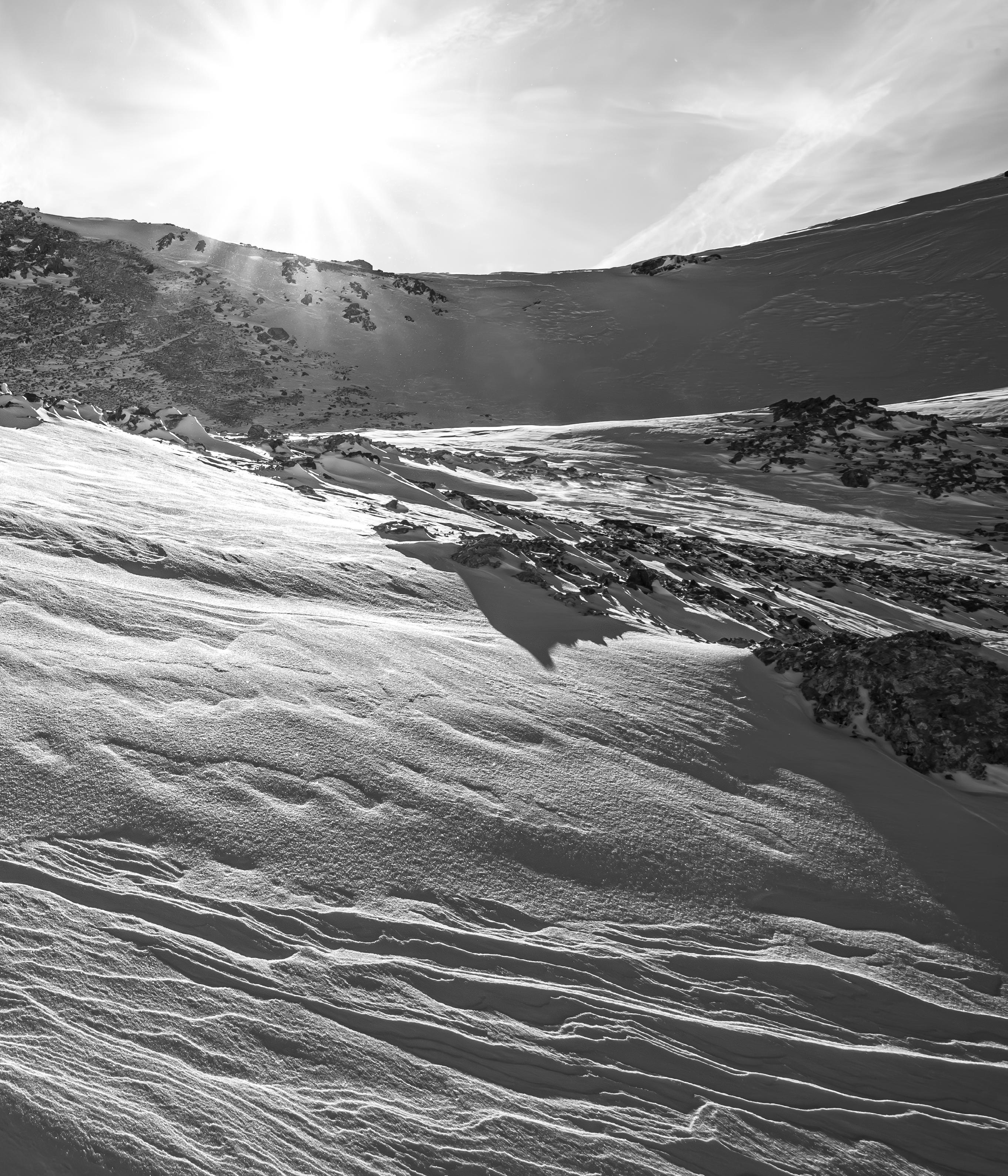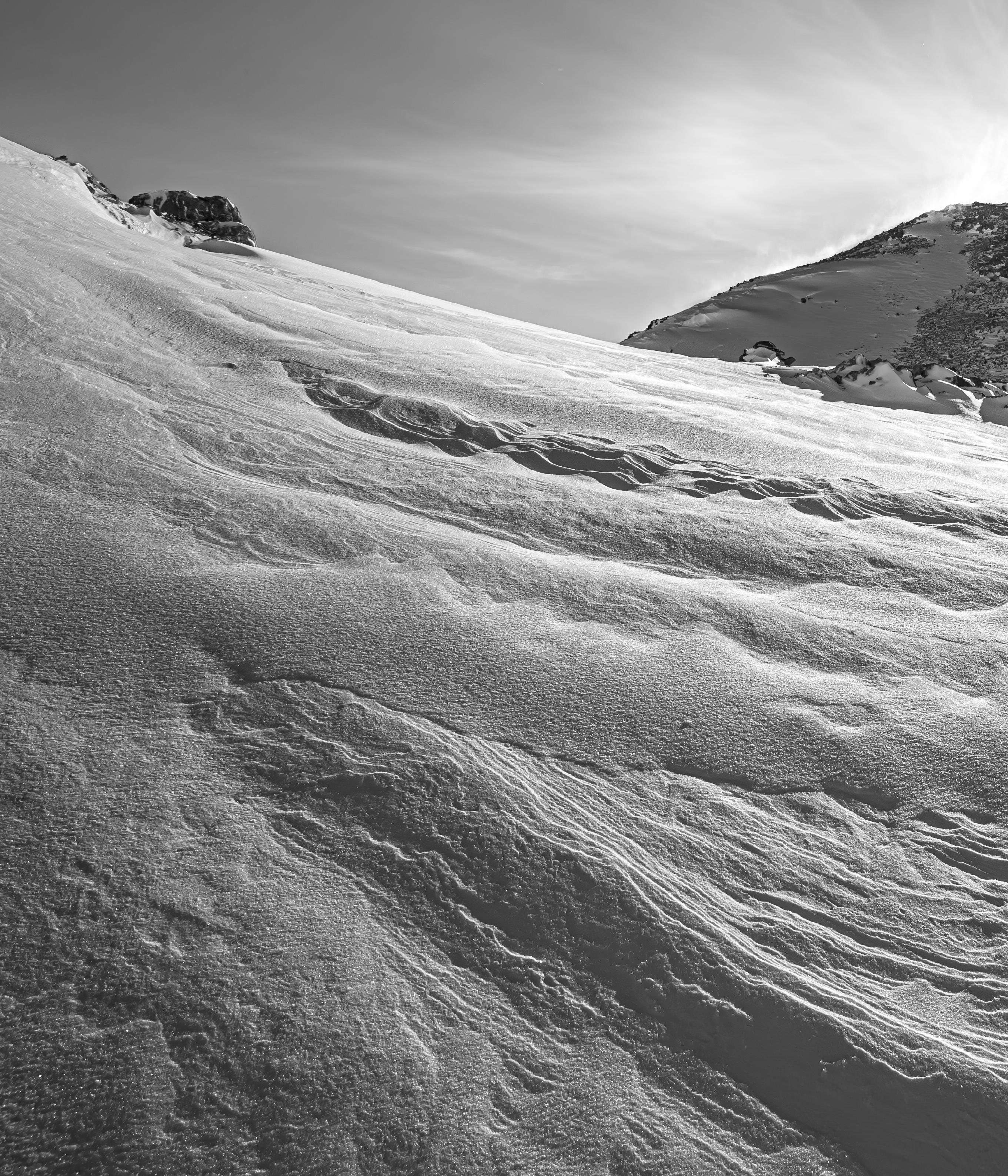 Die Abfahrt erfolgt bis zum Kälberlahnzug erfolgt entlang der Aufstiegsspur. Das folgend offene Gelände erlaubt viele Varianten.