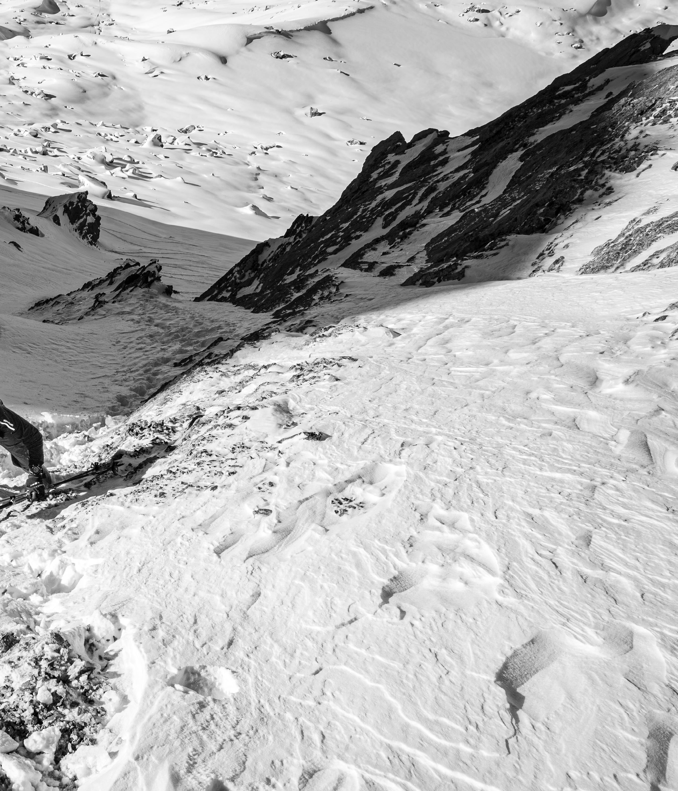 Die Schlüsselstelle bildet eine bis zu 40° steile Rinne südlich der Feuerspitze. Die 2.852 Meter hohe Feuerspitze bietet wunderbare Aussichten in alle Richtungen und einige Abfahrtsvarianten im weitläufigen Gelände unterhalb des Kälberlahnzugs.
