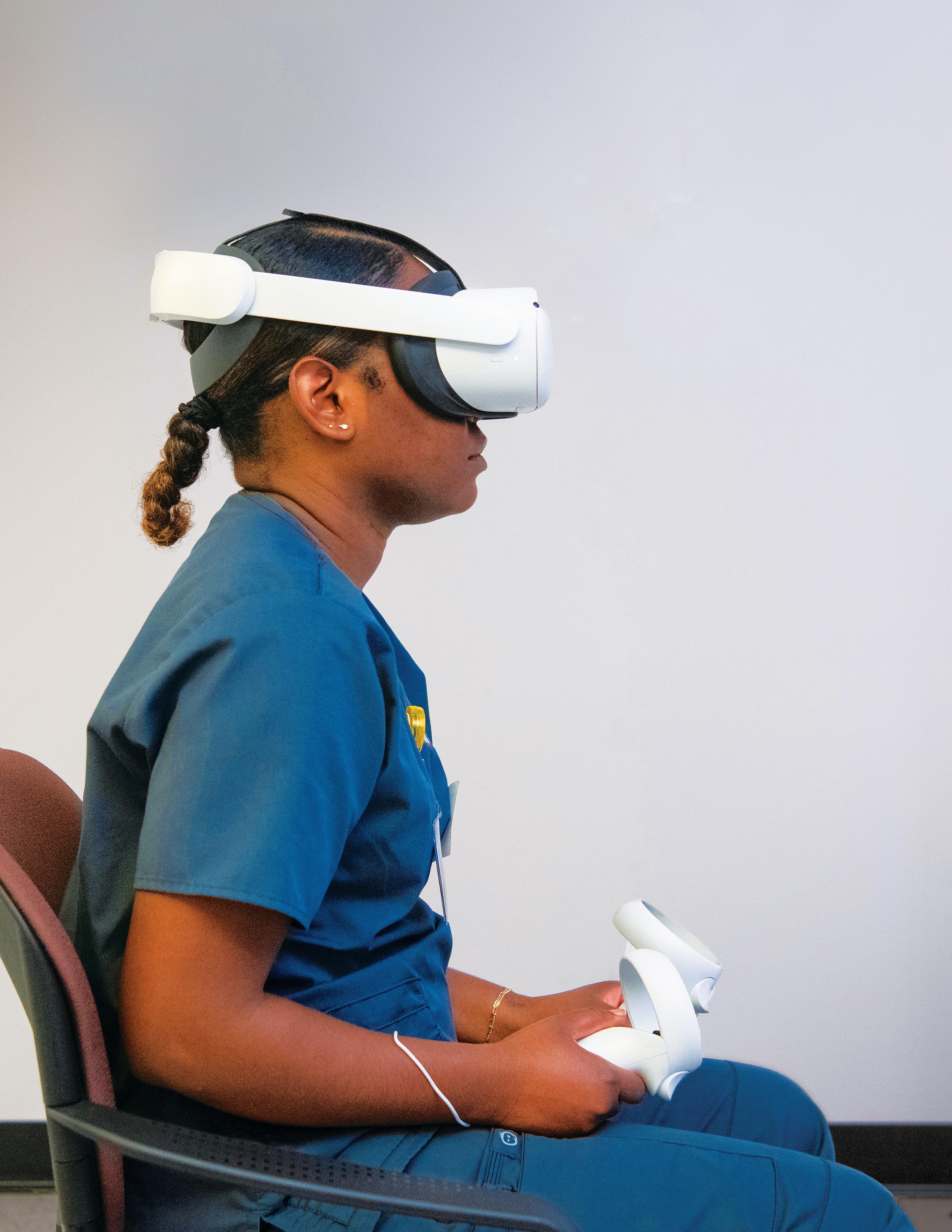 This has been happening in a simulation lab at the Universities at Shady Grove with entry Bachelor of Science in Nursing students since last fall and began this summer in Baltimore in an entry Master of Science in Nursing obstetrics course. Students may experience different scenarios once they don a VR MetaQuest 2 headset that allows them to use Oxford Medical Simulation software, but they are all interacting with artificial intelligence-driven patients who adapt their responses as students make clinical decisions. After students are individually immersed in the scenario, they debrief as a small group.
