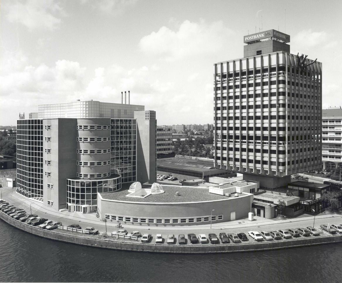 In 1975 opent net buiten de historische binnenstad een nieuw gebouw voor de Postcheque- en Girodienst, voorloper van de Postbank en ING. De paddenstoelvormige toren van architect Abe Bonnema ontwikkelt zich in de loop der jaren tot een icoon voor Leeuwarden, met hoog tegen de gevel het lichtkunstwerk ‘Schrijvende Hand’ van Marte Röling.