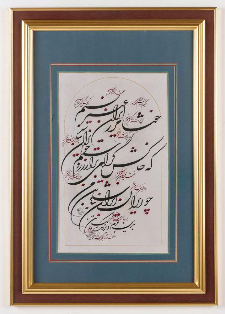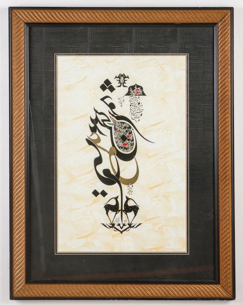 440. Ali Shirazi (Iranian, b. 1960) Calligraphy, 2008, mixed media illustration, signed. Framed. Size: 11'' x 22.5'', 28 x 57 cm (sight); 25.5'' x 37.5'', 65 x 95 cm (frame). $200 -400. Start: $100