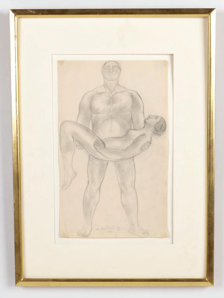 55. Abraham Walkowitz (American, 1878-1965) Figures, pencil drawing, signed and dated 1905. Size: 14'' x 8.5'', 36 x 22 cm (sheet); 22'' x 16'', 56 x 41 cm (frame).