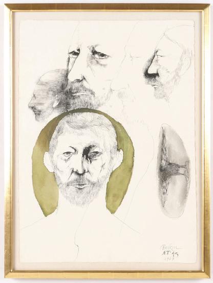 48. Leonard Baskin (American, 1922-2000) "Self Portrait at 45", 1968, ink and watercolor painting on paper, signed and dated. Framed. Size: 31'' x 22.25'', 79 x 57 cm (sheet); 35'' x 26'', 89 x 66 cm (frame).