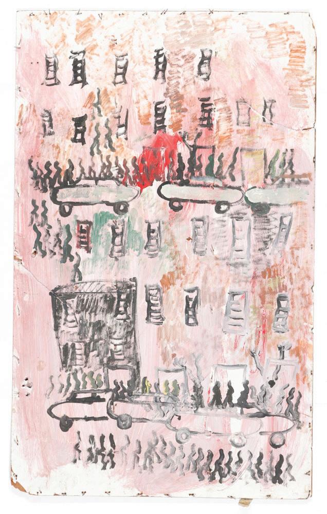 396. Unknown Artist (20th c.) "Town", mixed media painting on board, signed. Unframed. Size: 13.5'' x 23.5'', 34 x 60 cm (board).