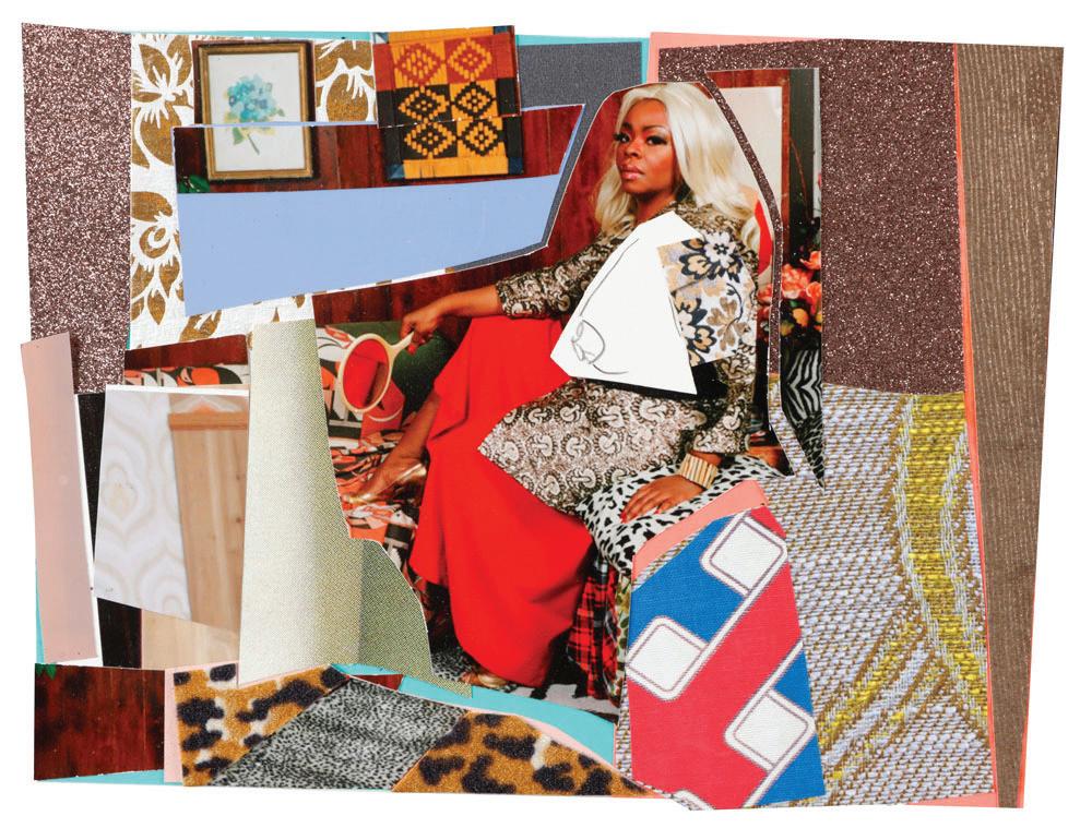 34. Mickalene Thomas (American, b. 1971) "Din avec la main dans le miroir et jupe rouge", unique mixed media collage. Framed. Size: 10'' x 13'', 25 x 33 cm (collage); 15'' x 18'', 38 x 46 cm (frame). Private Collection, Philadelphia; Acquired from Aperture Foundation, NY in 2017.