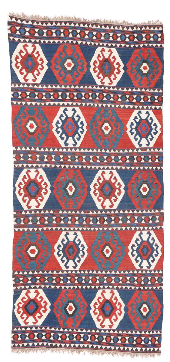 11. Shahsevan Kilim Runner, Transcaucasus, Early 20th C., 2'6'' x 8'3'' (76 x 251 cm). Weight: 8 lbs. Material: wool surface, wool warp. Provenance: John T. Wertime Minimalist Collection.