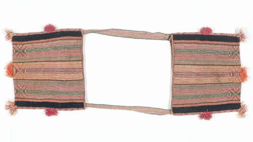 598. Talegas, Saddle Bags, 19th C. Original straps. Camelid warp and weft. Natural dyes. Used to carry goods over the shoulders of people and the hinds of camelids. Each bag: 11'' x 12'' (28 x 30 cm).