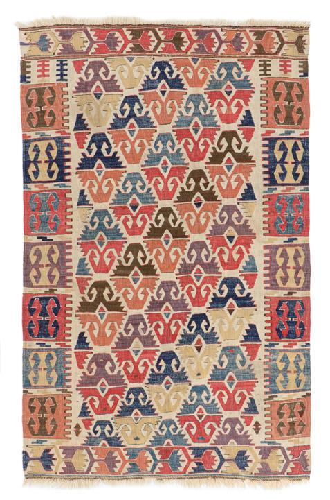 4. Anatolian Kilim, Siirt Area, Turkey, Early/Mid 20th C., 4'0'' x 5'6'' (122 x 168 cm). Weight: 5 lbs. Mohair. Published: HALI Magazine, London, 2022, issue 213, page 129. $1000-1500 Start: $500