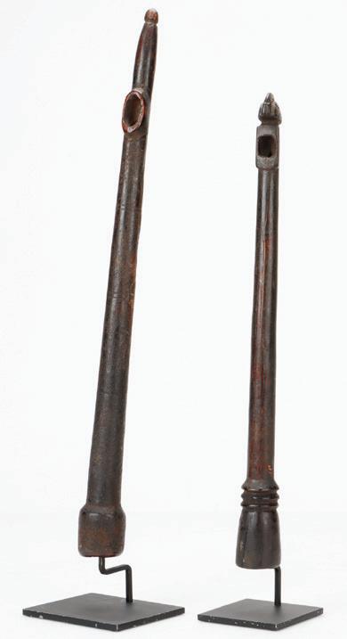 35. 2 Mossi Masks, Burkina Faso. On stands. Wood, traces of natural pigment. Size: 10 26’’ x 6’’ x 7’’ (66 x 15 x 18 cm). 20 Size: 22’’ x 5’’ x 7’’ (56 x 13 x 18 cm). TW008 & TW005.