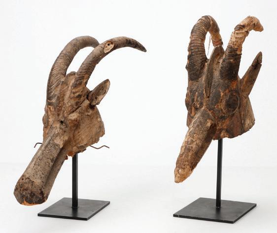 23. 2 Bwa Bush Cow Masks, Burkina Faso. On vintage Amyas Naegele bases. Wood, natural pigment, wire. Size: 1) 20’’ x 11’’ x 9’’ (51 x 28 x 23 cm). 2) 15’’ x 9’’ x 9’’ (38 x 23 x 23 cm). # TW0087, original #2016 & TW0090, #2139.