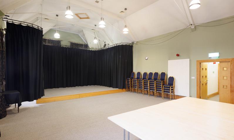 This is a big room used for talks and performances. There is a stage surrounded by black curtains. Sometimes there can be bright theatre lights and loud sounds depending on what’s on.