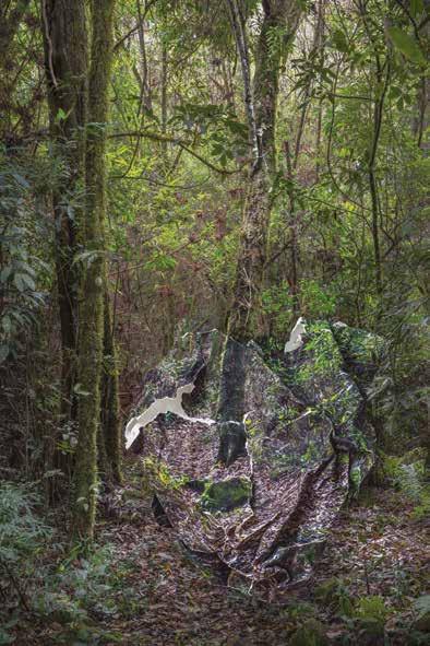 Les œuvres des deux artistes, très différentes, s’inscrivent chacune à leur manière dans ce lieu. Andrej Polukord réfléchit au devenir des forêts en Lituanie, qui sont menacées par le braconnage et la déforestation massive. Dans un esprit à la frontière de la performance et de la photographie, il se juche sur des troncs d’arbres victimes de la déforestation et se fait photographier dans ces positions précaires. Les images obtenues sont celles d’une forêt sacrifiée pour l’élévation de l’homme, qui se voit en héros dominant le reste du monde. Cette série, Wood Statues , est très ironique, caustique même. Au sein de la chapelle, elle entre en dialogue de manière curieuse avec les nombreuses stèles en pierre dressées contre les murs, figurant des personnages importants du passé, dont plus personne ne se souvient. Quant à Léa Habourdin, elle s’intéresse depuis longtemps à l’existence à la fois ancienne et fragile des arbres et des plantes, ainsi qu’à la disparition progressive de la flore au sein des différents environnements qu’elle explore. Dans l’œuvre qu’elle présente à la chapelle SaintJean, inspirée d’une résidence à Nida, on percevra des réminiscences des fresques. [Dans la chapelle, un ensemble de fresques réalisées vers 1520 par l’atelier bâlois de Hans Herbster raconte la vie de Saint JeanBaptiste et la Passion du Christ.] Mais au-delà de ces échos formels, la chapelle donne une résonance particulière à la nécessité de sanctuariser la nature, de la protéger, qui affleure dans les œuvres d’Andrej Polukord et de Léa Habourdin.