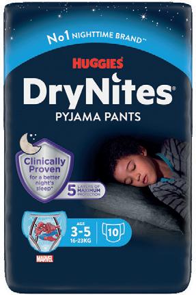 hjälper DryNites till så att barn får en god nattsömn. DryNites har extra bra skydd, är designade så att de liknar vanliga underbyxor och utvecklade i ett särskilt tyst material. DryNites finns i tre olika storlekar och i smarta designer för både flickor och pojkar, där absorptionsytan är optimalt placerad med tanke på deras olika anatomi. Nattblöjorna är diskreta och tillverkade av ett material som inte prasslar när barnet rör sig.