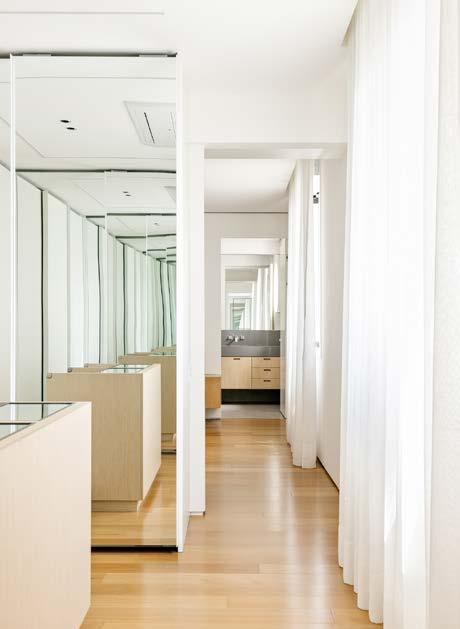 Two symmetrical suites that share a fully furnished bathroom were designed with doors integrated into the furniture, thus being hidden from the views of all rooms. The project also features another suite with a separate bathroom.