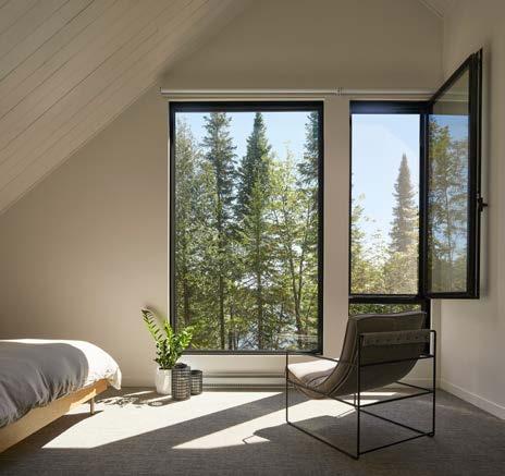 The exterior materials were chosen to minimize maintenance, prioritize durability, and promote local purchasing. The exterior walls are covered with a single material, Quebec cedar, whose outer face has been burned to give it a blackened appearance (Japanese-inspired Shou sugi ban technique). The roof, on the other hand, is covered with black steel sheeting, and its steep slopes and generous overhangs were designed to keep water and snow away from the perimeter of the house.