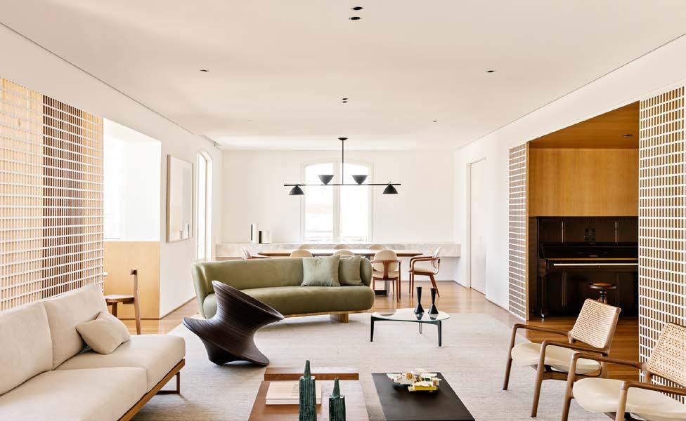 The living room, TV room, dining room, hall and balcony have been floored in Peroba Dourada by Indusparquet. The panels and the Muxarabis in white paint, both in American Oak are by Ulimax. The curved sideboard in Calacatta Michelangelo Marble is by Arthus. And the carpentry in lightened walnut veneer and painted frame is by Status Marcenaria.
