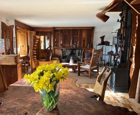 The Steading is considered Tim's masterpiece with the interior completely clad in sculpted wood: floors, walls, ceilings, stairs, cupboards, beds, a grandfather clock, sink, conservatory, hanging sculptures, desks and so on – all made by Stead himself. This exceptional building now aims to become a hub for practical expertise in everything to do with wood and the environment, hosting a variety of day and residential courses in the unique environment of The Steading.