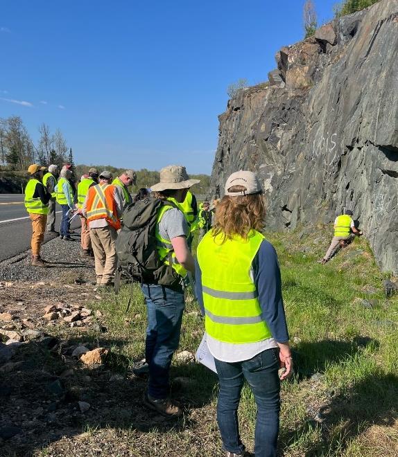 The Southern Complex is composed of ‘dome-and-keel’ type structures that are characterized by elongate domes of Archean basement surrounded by keels of Paleoproterozoic strata of the Marquette Range Supergroup. The rocks observed here are representative of the magmatic, metamorphic, and structural evolution of the Southern Complex with regards to the unique geologic history of the surrounding area. After brief safety talks and geologic interpretations at each of the roadside stops, the group of geologists were able to do what they do best. To help identify minerals in the rock, participants were equipped with rock hammers, safety glasses, hand lenses, and high visibility vests. This essential combination of tools ultimately meant that there was not a single, publicly accessible rock that was left unidentified by this group of geologists (Figure 2).