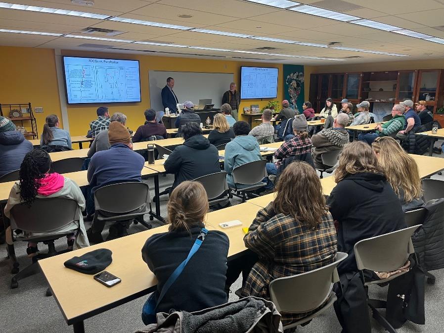 Dr. Adam Simon, professor of geology at the University of Michigan and the Society of Economic Geologists’ distinguished lecturer of the year, finished off day two with an awe-inspiring presentation on IOCG-IOA type deposits (Figure 4). IOCG-IOA, or iron oxide-copper-gold/ iron oxide-apatite, deposits contain large quantities of important metals such as iron, copper, and gold. These deposit types are crucial for a future dominated by green energy because they contain abundant iron oxides and may contain silver, gold, cobalt, rare earth elements, nickel, uranium, and vanadium as economically important by-products (Rodriguez-Mustafa and others, 2020). Once the presentation concluded, folks hung around the area to network and to ask any rock-related questions that arose during the talk.