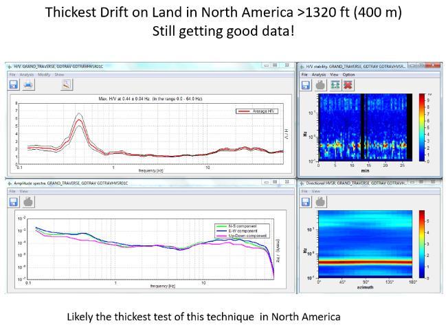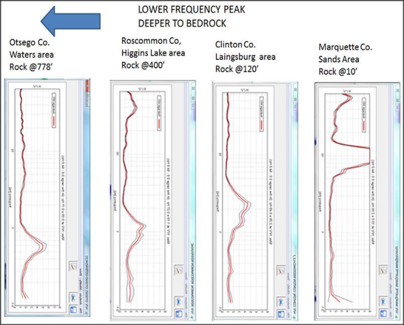 Michigan has the thickest drift on land in North America, but the thickness is quite variable and the underlying bedrock surface is very irregular. Many places have a poor distribution or quality of bedrock depth control points. The bedrock surface is a fundamental surface for many geological, environmental, and engineering investigations. Drilling to bedrock or running geophysical surveys to determine bedrock depth can often be cost prohibitive. The HVSR method allows one to determine glacial drift thickness (bedrock depth) if there are strong enough velocity and density contrasts between the drift and underlying bedrock. The HVSR method uses naturally occurring seismic noise (wind, waves, flowing water, distant weather) and man-made noise (vehicles, industry) as an energy source. A single station, threecomponent seismometer (two horizontal and one vertical) is used to record the ambient seismic noise.