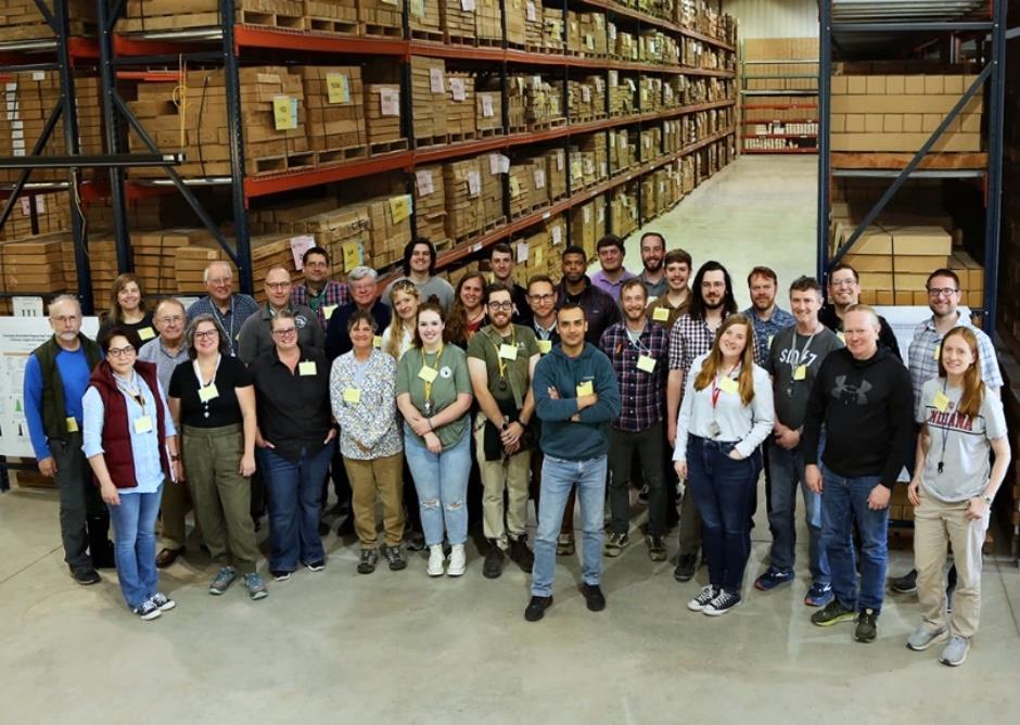 When we received a phone call from Mosaic Corporation in 2008, offering us a core collection from their operations, we had no idea how much core they had, what it contained, or how we would play a role in preserving and researching a multi-billion-dollar resource. We thought we would fill up a pick-up truck with the core and bring it to our repository. Five semi-truck loads of core later, we saw the magnitude of the collection. The cores came from 77 different wells in 9 counties. All 11,400 linear feet of 4-inch evaporite core remained sealed in plastic sleeves, keeping it intact since it was drilled in the 1980’s. Those cores now fill 81 3ft-high pallets in our archive (Fig. 1).