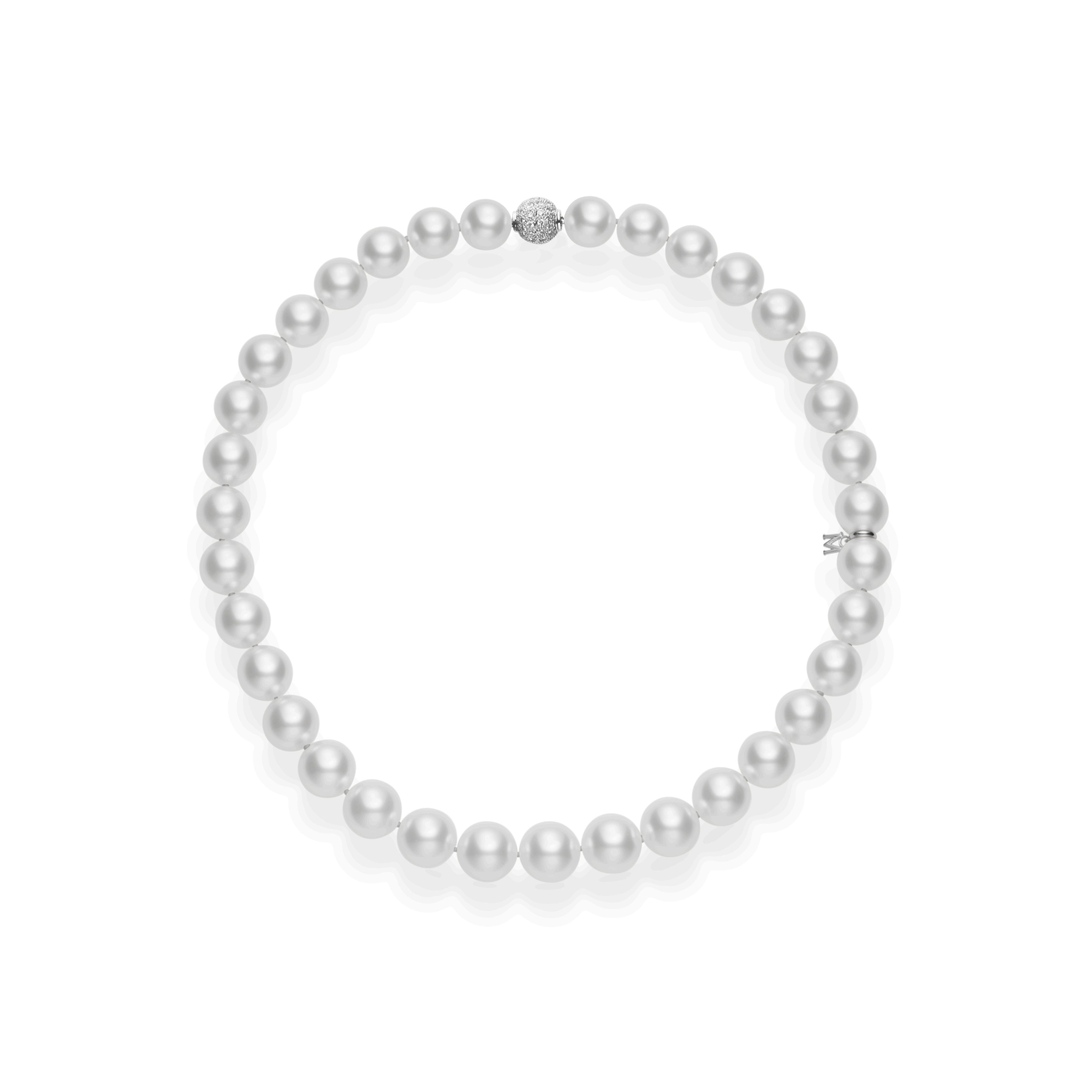 The magnificent, satiny luster of these fantastic white pearls is produced by the silver-lipped South Sea oyster. Their subdued opalescence will subtly change in appearance under different light conditions, making them a constant marvel to behold.